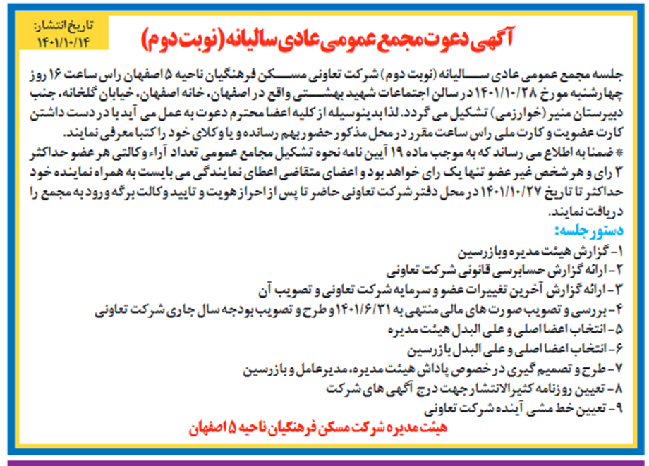 جلسه مجمع عمومي عادي ساليانه ( نوبت دوم )  شركت تعاوني مسكن فرهنگيان ناحيه 5 اصفهان راس ساعت 16 روز چهار شنبه مورخ 1401/10/28 در سالن اجتماعات شهيد بهشتي واقع در اصفهان خانه اصفهان خيابان گلخانه جنب دبيرستان منير(خوارزمي) تشكيل مي گردد لذا بدينوسيله از كليه اعضاء محترم دعوت بعمل مي آيد با در دست داشتن كارت عضويت و كارت ملي راس ساعت مقرر در محل مذكور حضور بهم رسانده و يا وكلاي خود را كتباً معرفي نمايند.