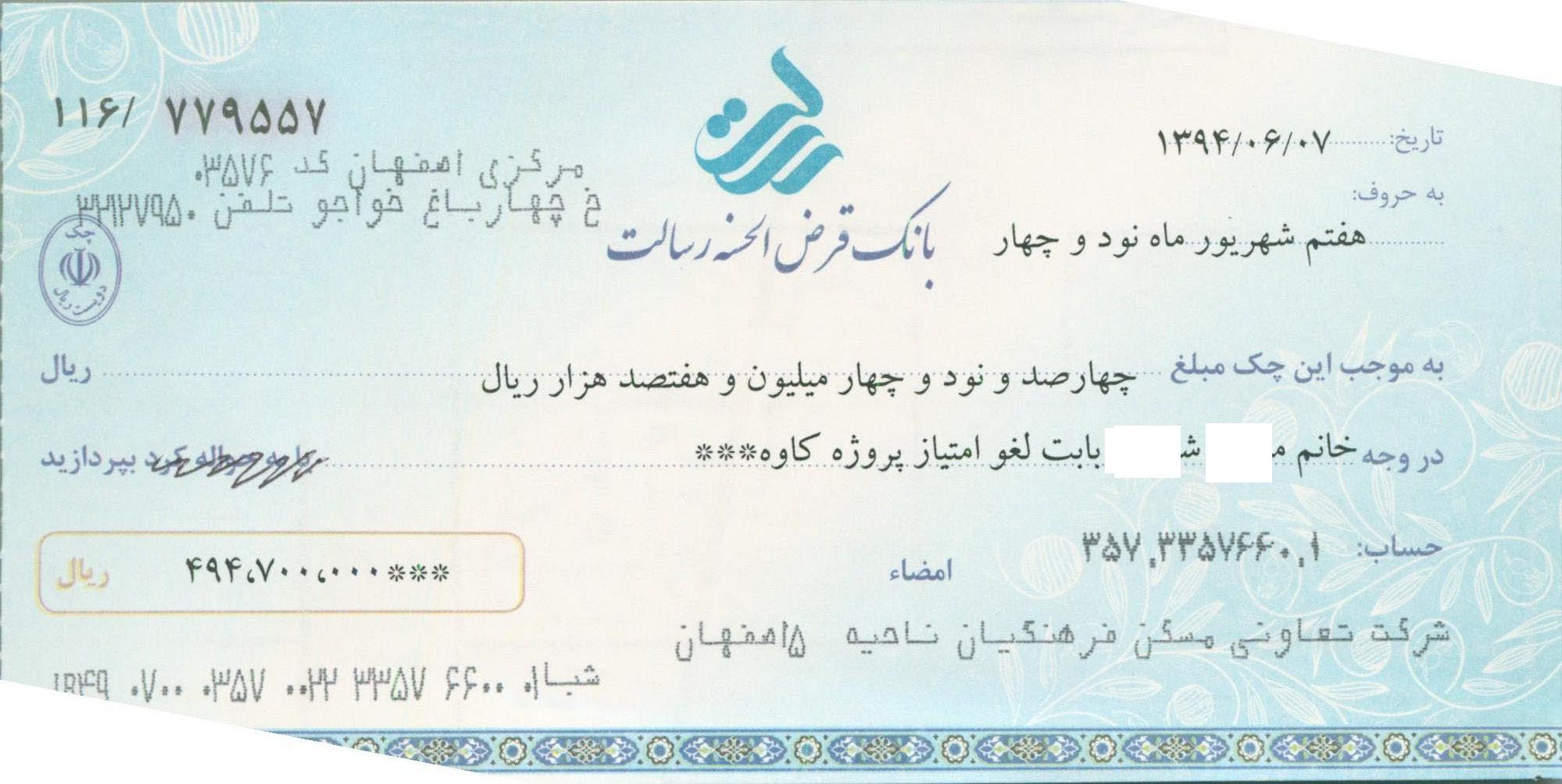 با توجه به ماده 58 اساسنامه تعاوني هاي مسكن و پيرو  دو اخطار كتبي ارسال شده در تاريخ هاي 26/03/1394 و 10/04/1394 جهت جلوگيري از خسارت و ضرر و زيان بيشتر به پروژه كاوه امتياز ايشان لغو و واريزي نامبرده پس از كسر 3 درصد هزينه هاي تعاوني مسترد گرديد .