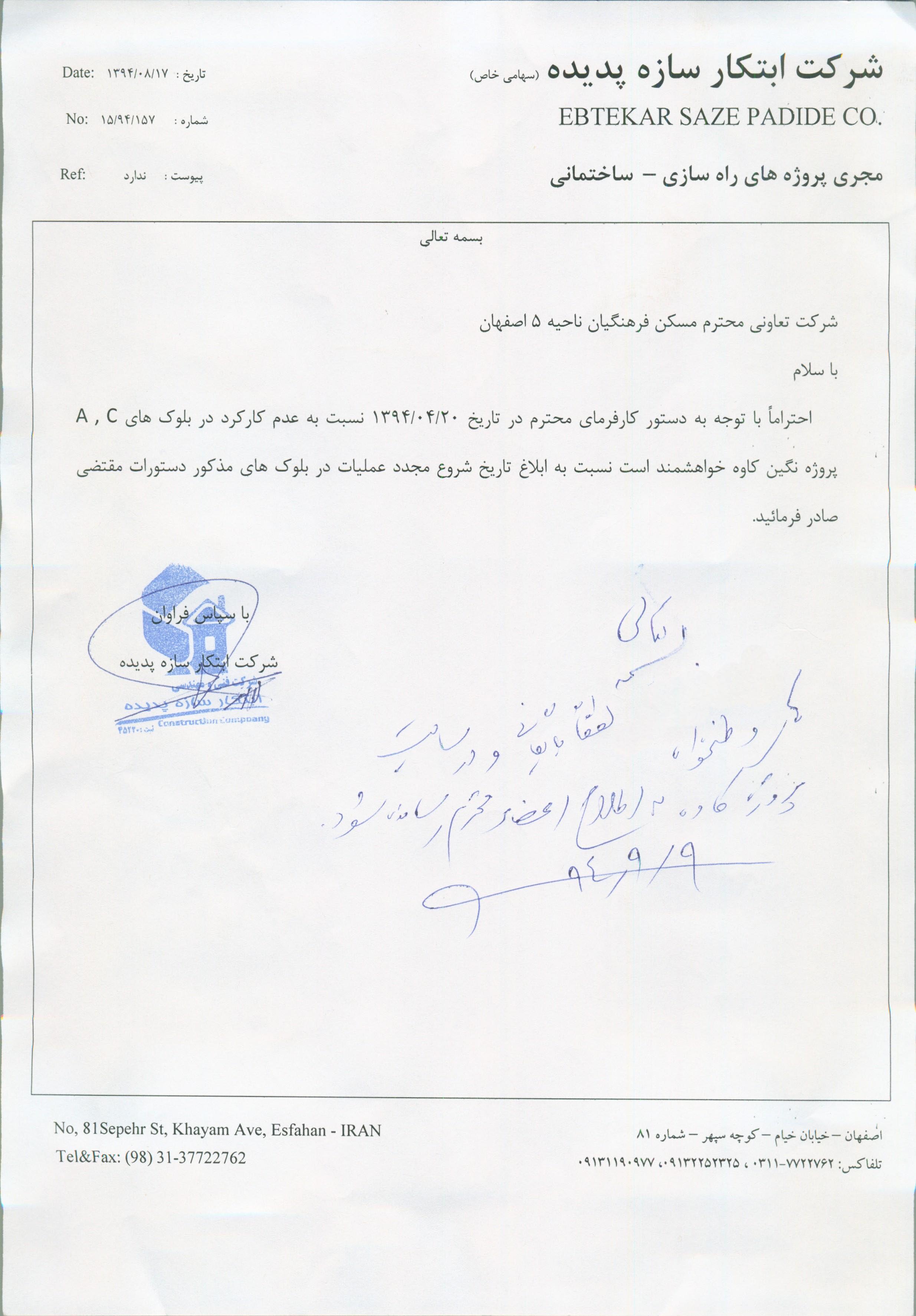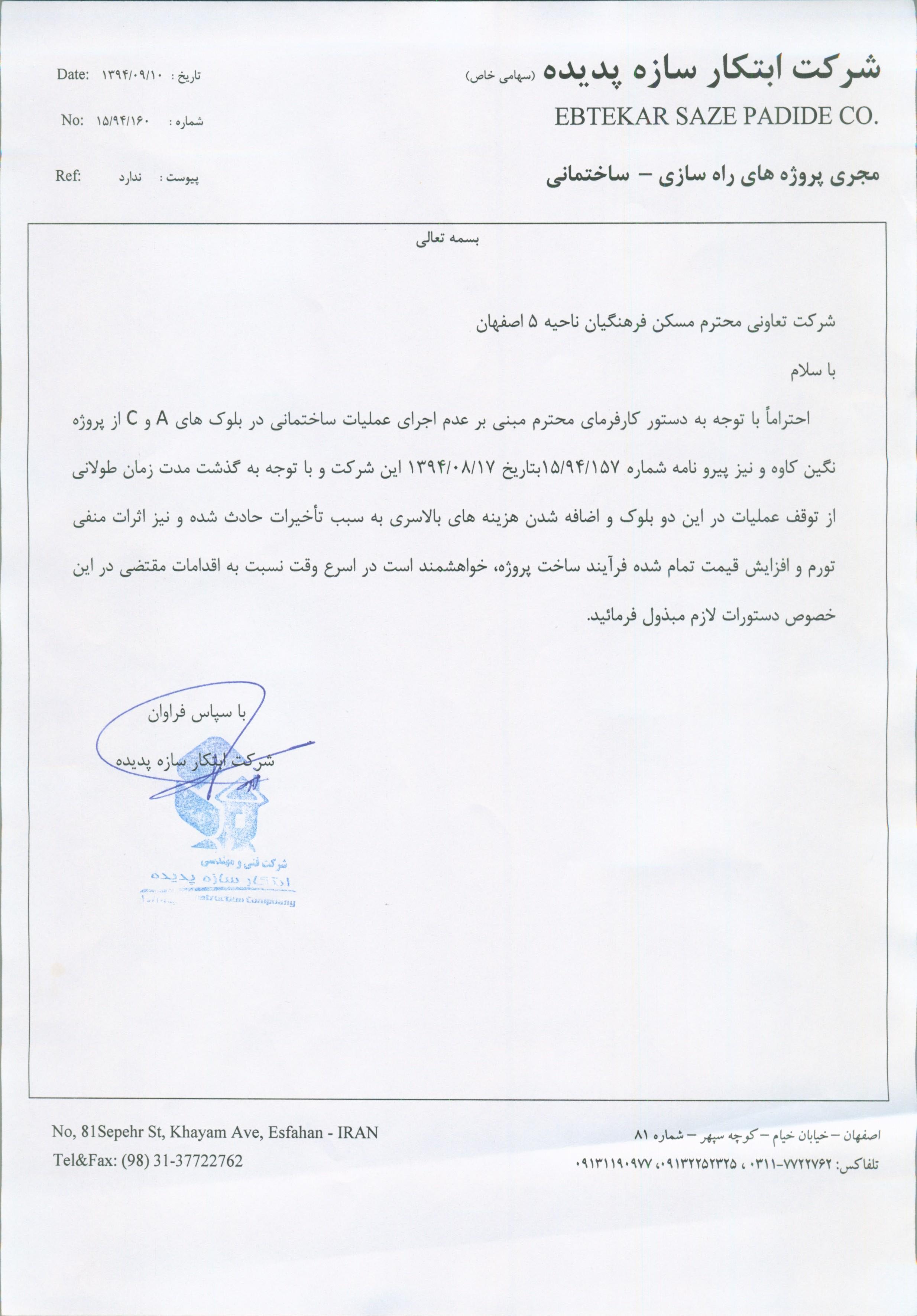 نامه های شرکت ابتکار سازه در خصوص پروژه کاوه